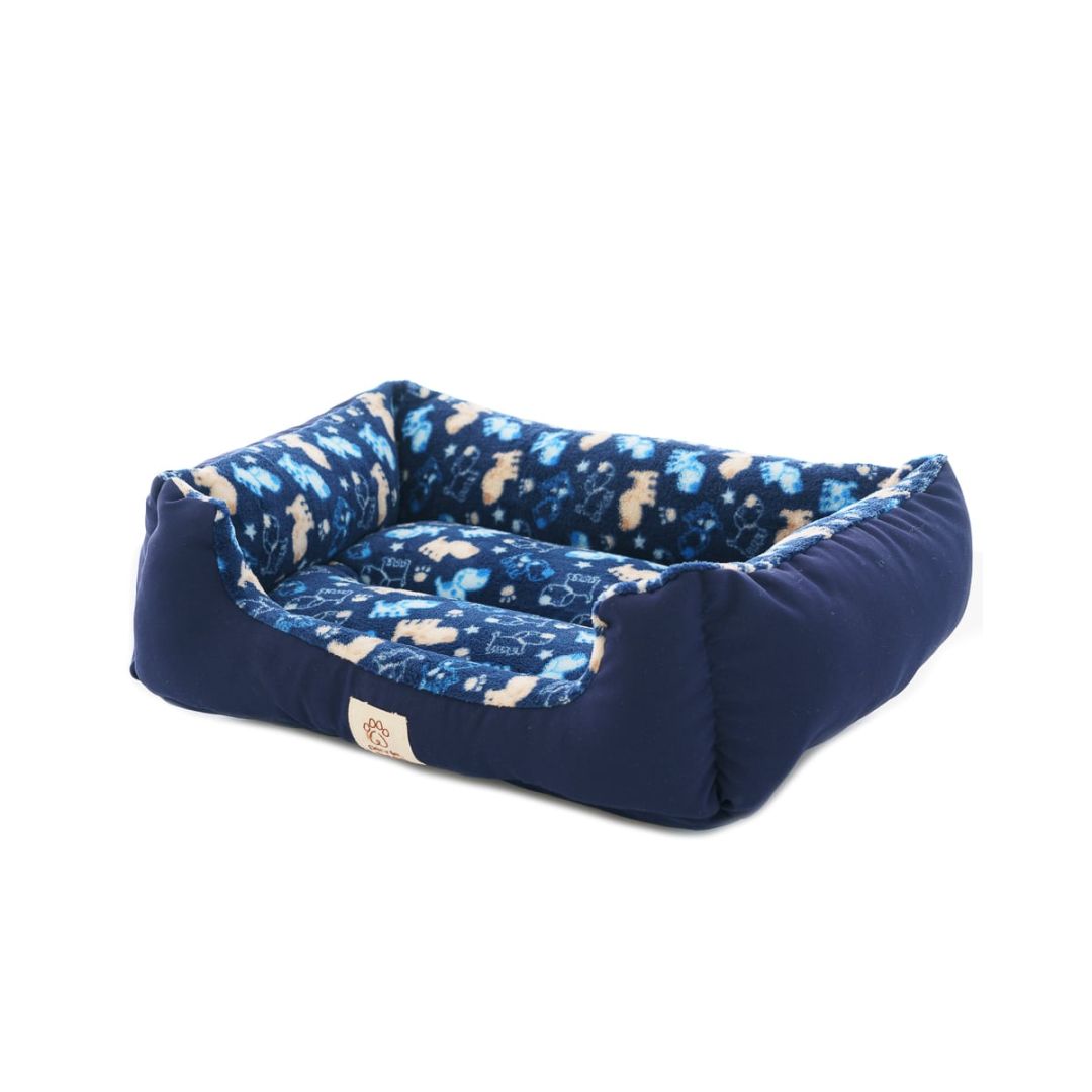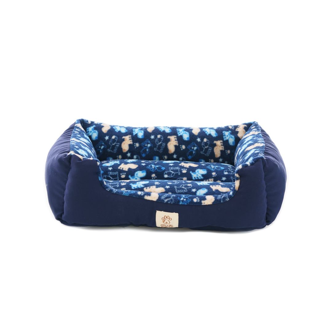 Εμπριμέ βελουτέ κρεβάτι κατοικίδιου με απαλή υφή. Δίχρωμο, πάνω πλευρά βελουτέ μπλε με ψηφιακή εκτύπωση κουτάβια και κάτω πλευρά μονόχρωμο blue black.