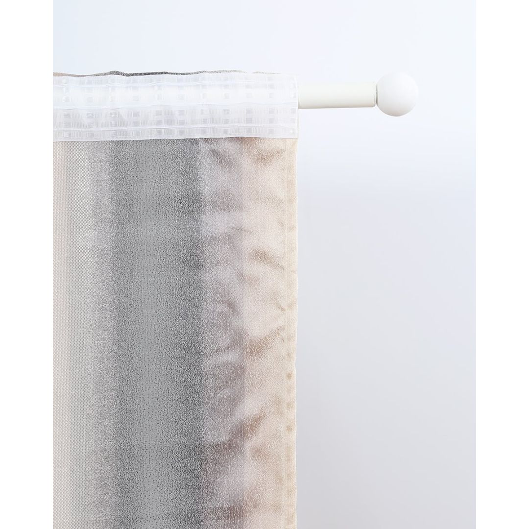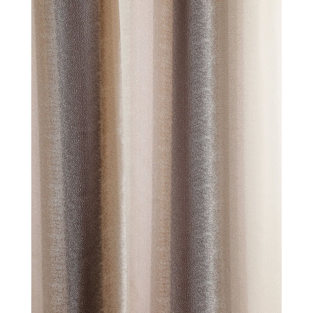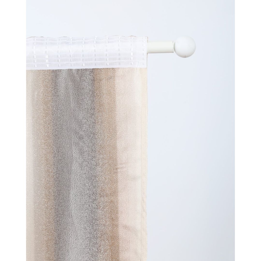 Έτοιμη ραμμένη μπεζ κουρτίνα με φαρδιά ρίγα με 8 εκατοστά τρέσσα & τούνελ, από 100% polyester.