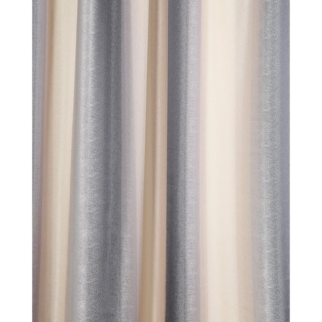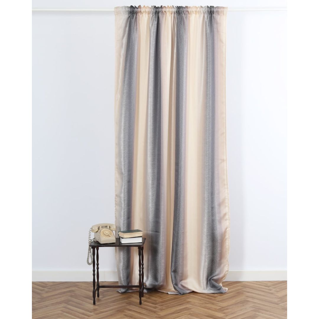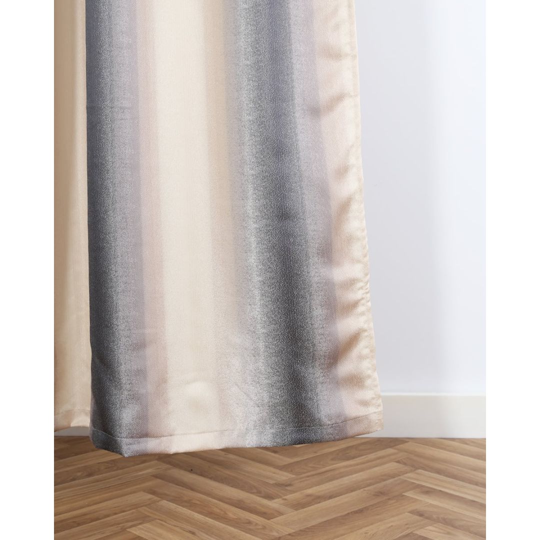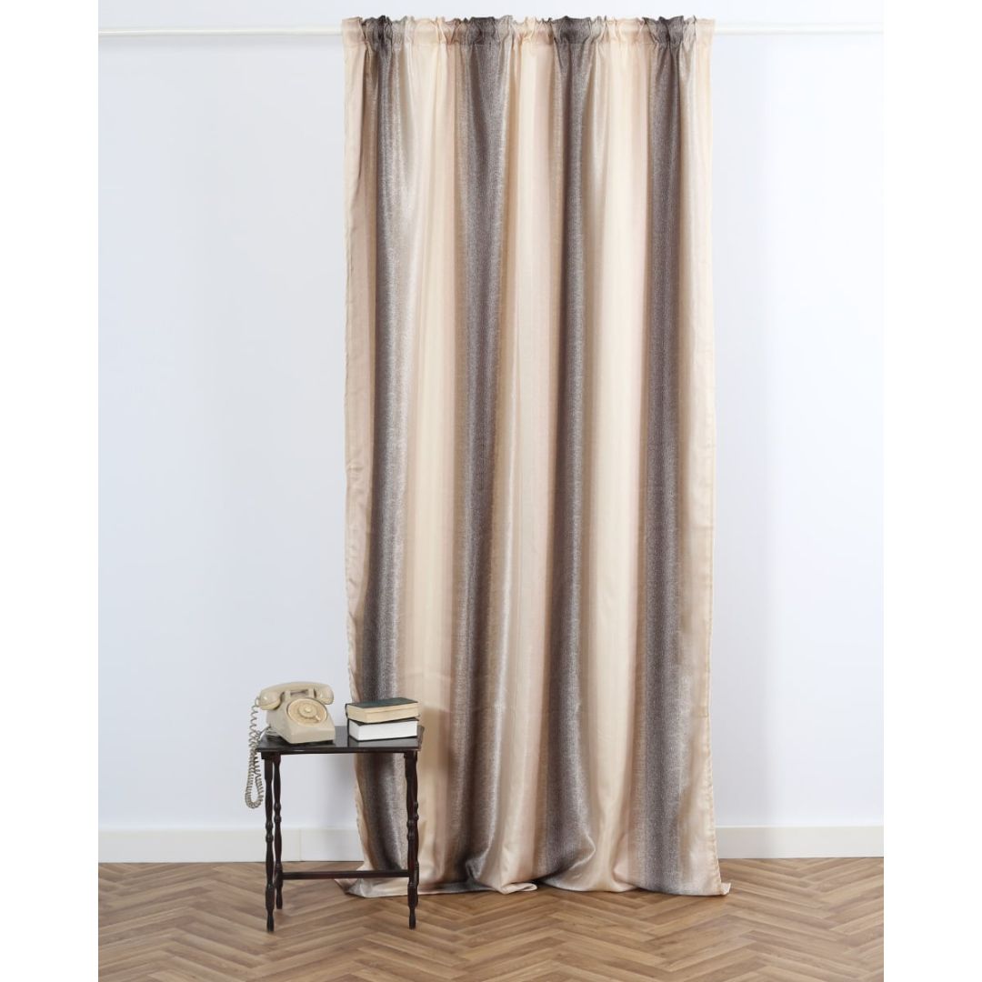 Έτοιμη ραμμένη μπεζ κουρτίνα με φαρδιά ρίγα με 8 εκατοστά τρέσσα & τούνελ, από 100% polyester.