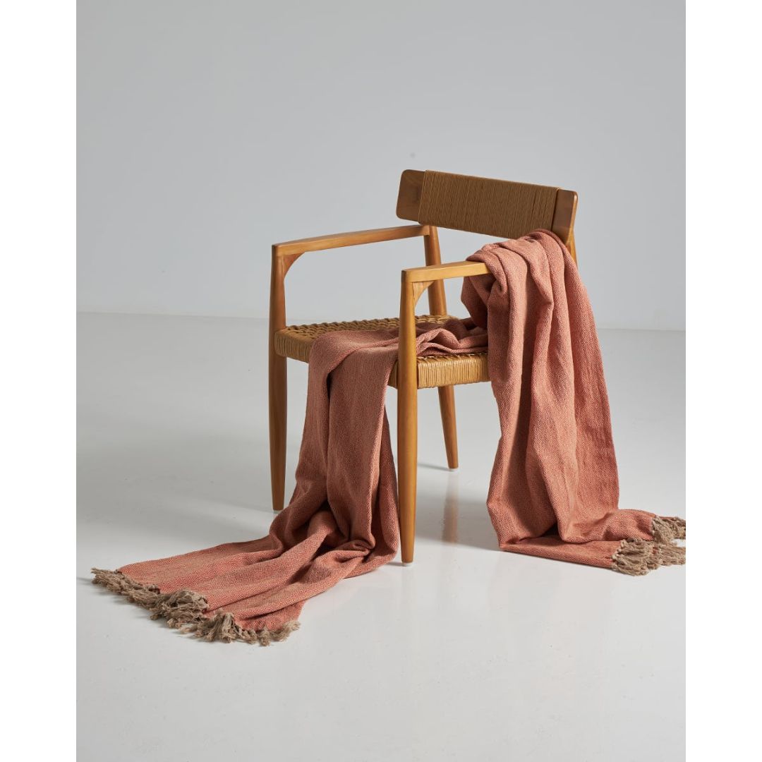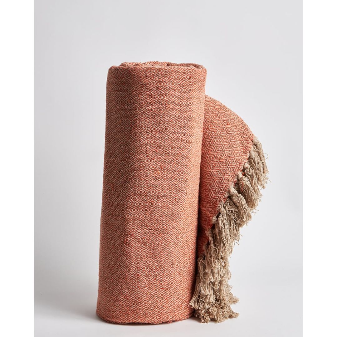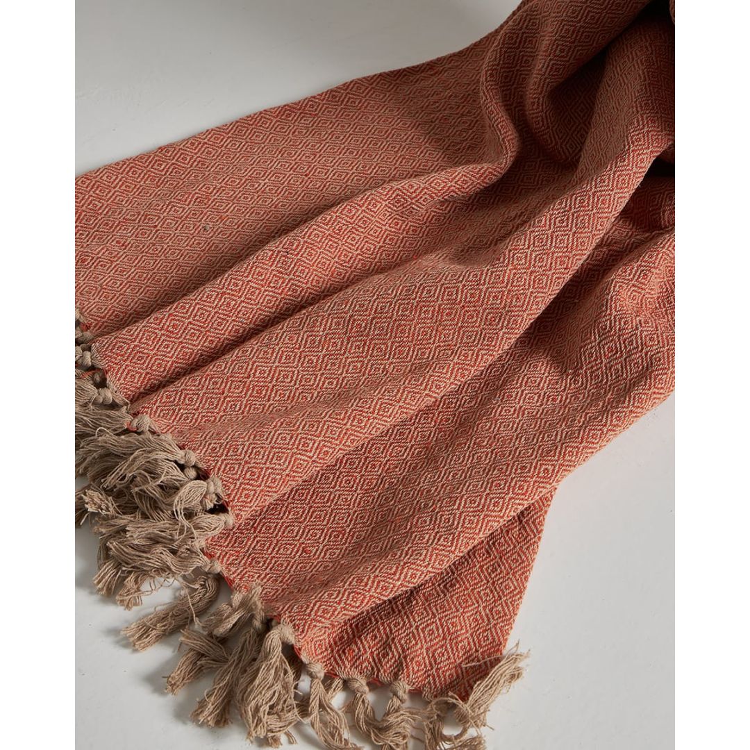 Μπεζ ριχτάρι αργαλειού με πλέξη diamond και φάσα, από 100% ανακυκλωμένο βαμβάκι.