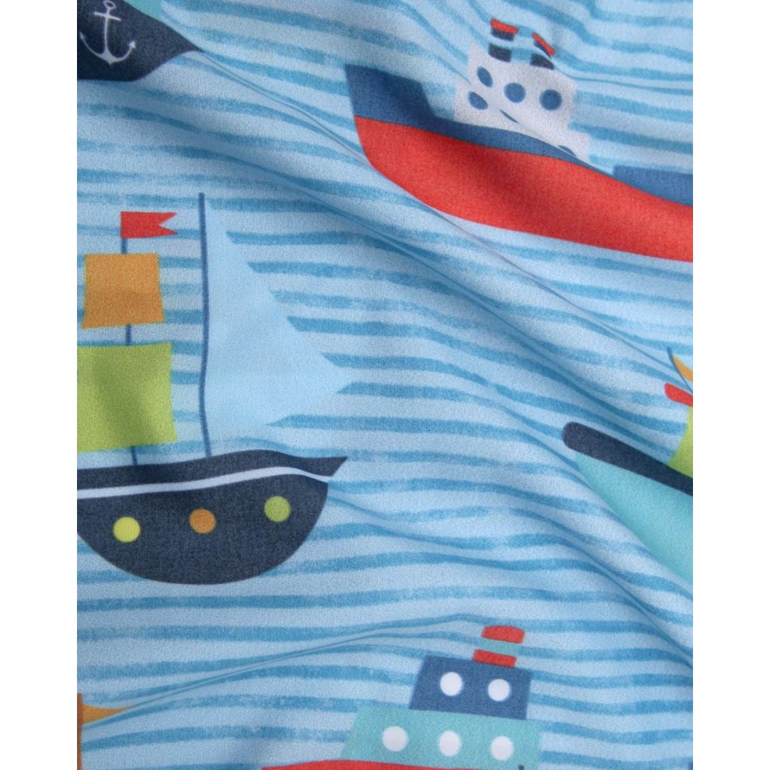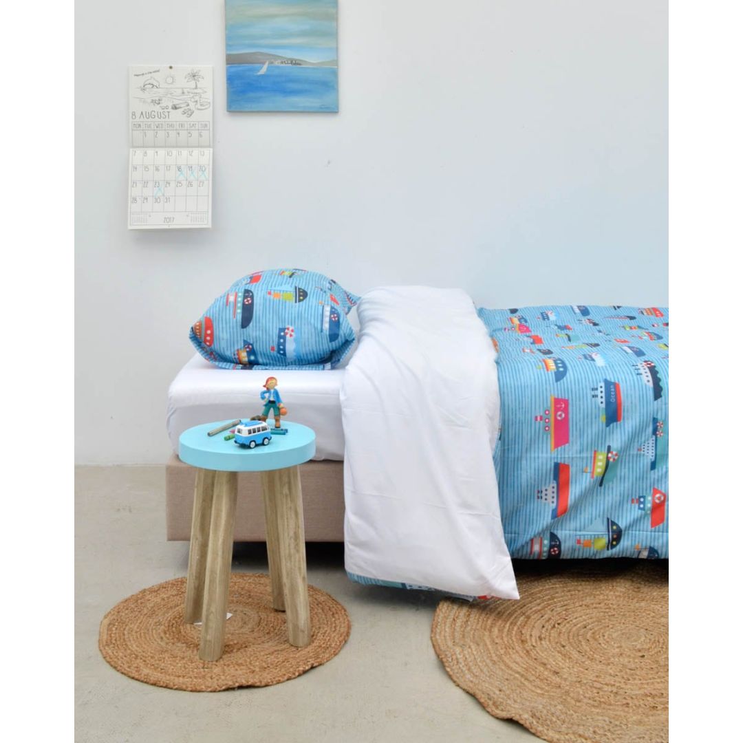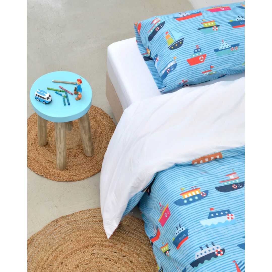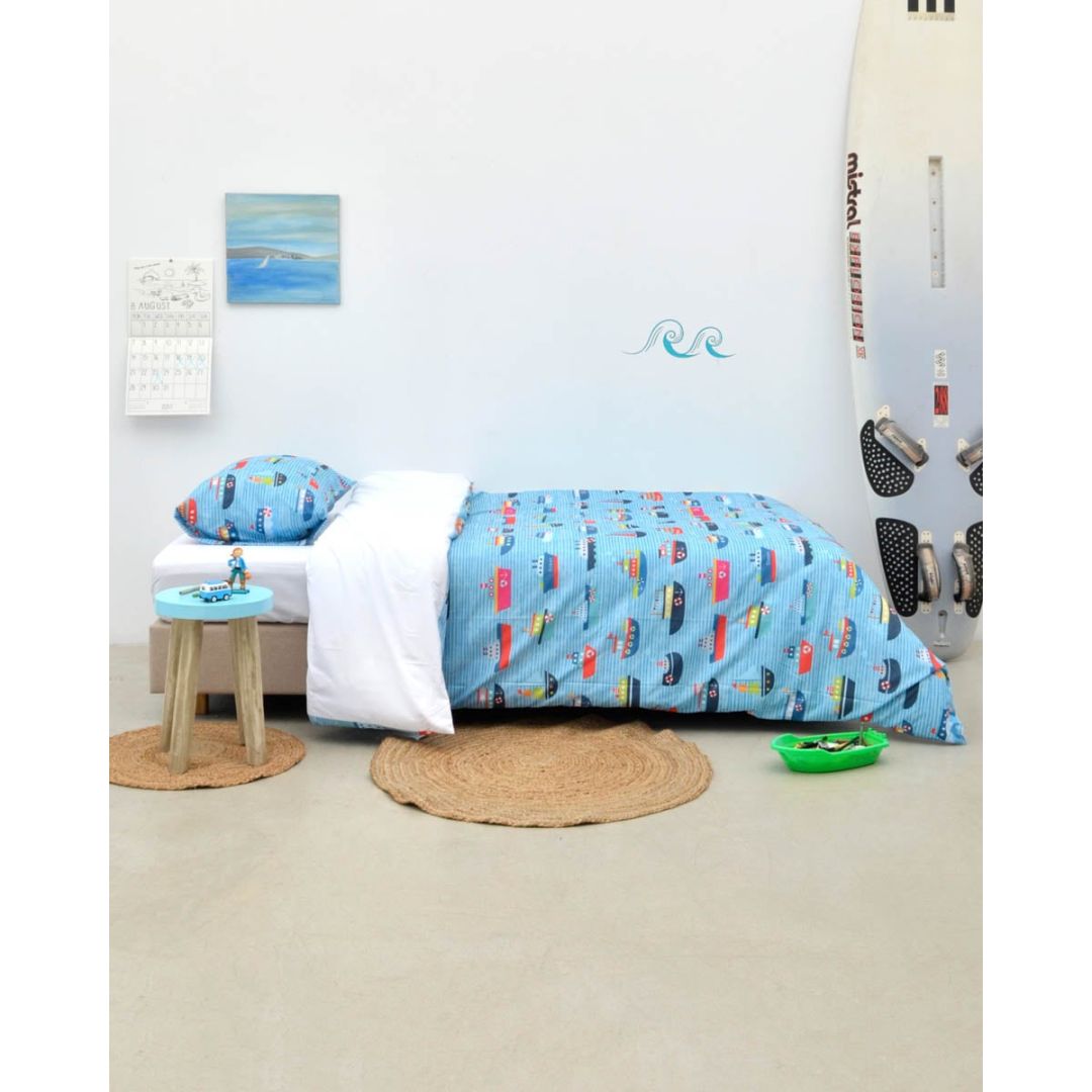 Παπλωματοθήκη κομποζέ εμπριμέ, ψηφιακή εκτύπωση σιέλ ριγέ με σχέδιο καραβάκια από τη μια πλευρά και λευκή από την άλλη, αντιαλλεργική, με πολύ απαλή υφή, non iron, από 100% microsilk.