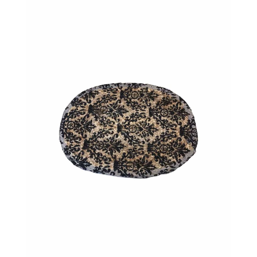 Ψάθα πλεκτό boho οικολογικό οβάλ χαλί εισόδου με μαύρο τύπωμα λουλούδια και περιμετρική φάσα, από 100% ίνες του φυτού γιούτα.