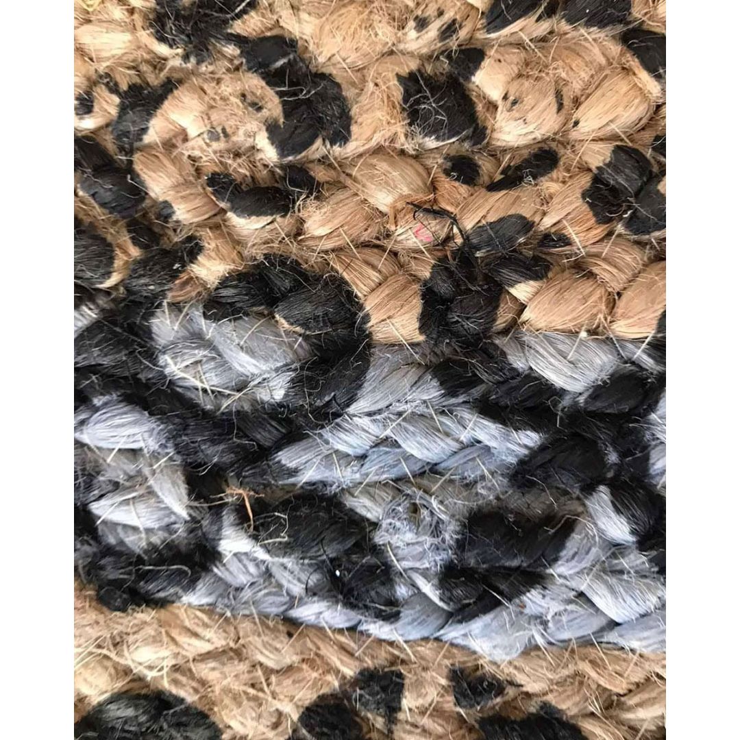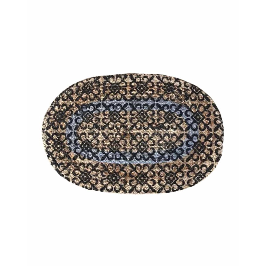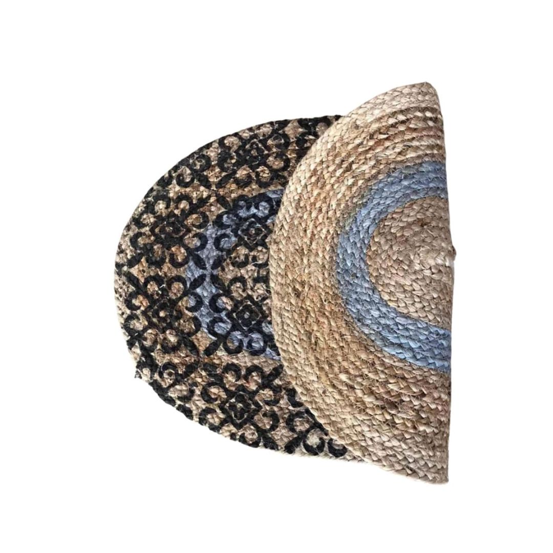 Ψάθα πλεκτό boho οικολογικό οβάλ χαλί εισόδου με τύπωμα λουλούδια και χρωματιστές ομόκεντρες φάσες, από 100% ίνες του φυτού γιούτα.
