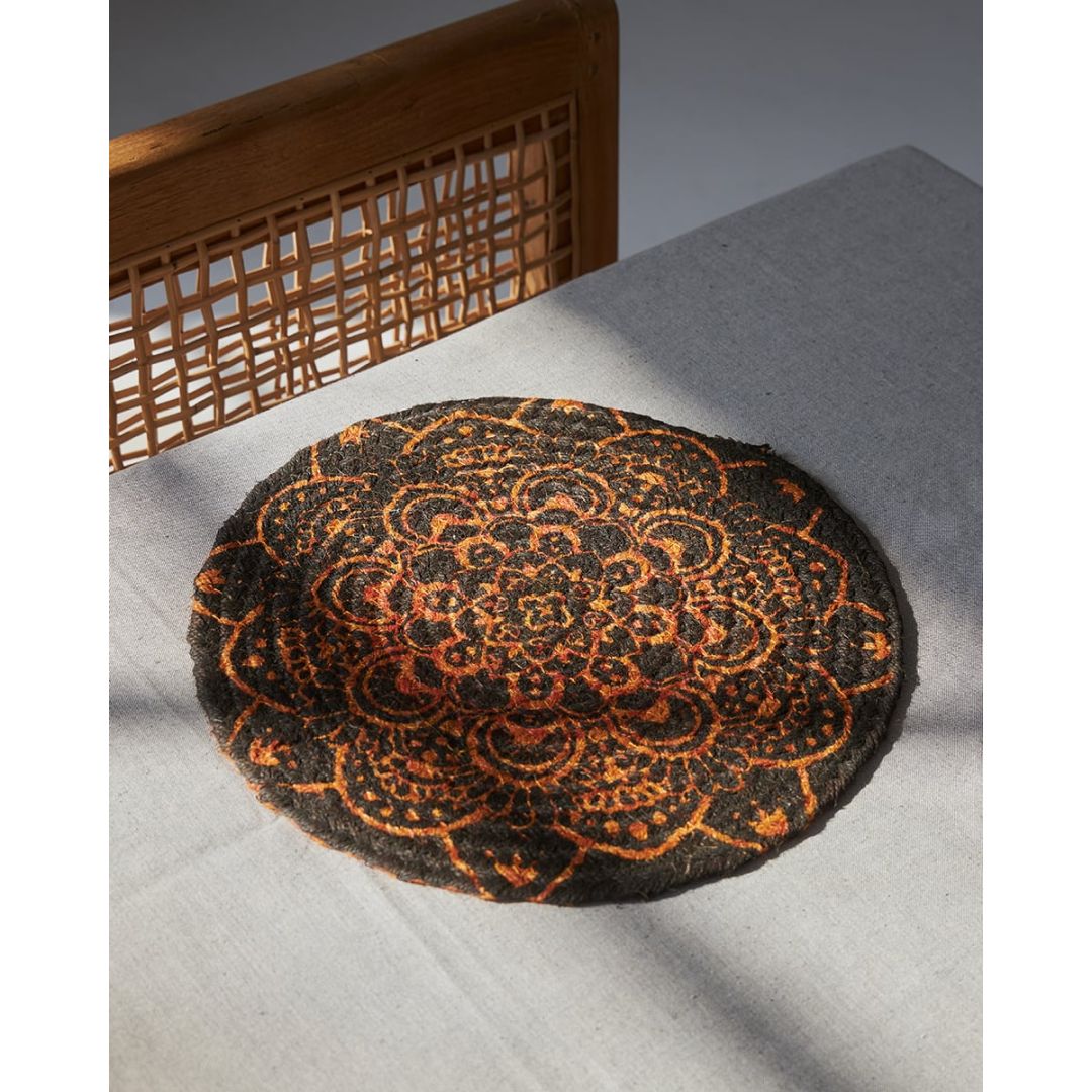 Ψάθα πλεκτό κεραμιδί οικολογικό boho σουπλά,Sous plate με μαύρο τύπωμα, από 100% ίνες του φυτού γιούτα. Διαθέσιμο σε διάμετρο 30cm.