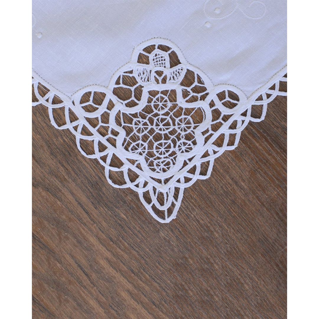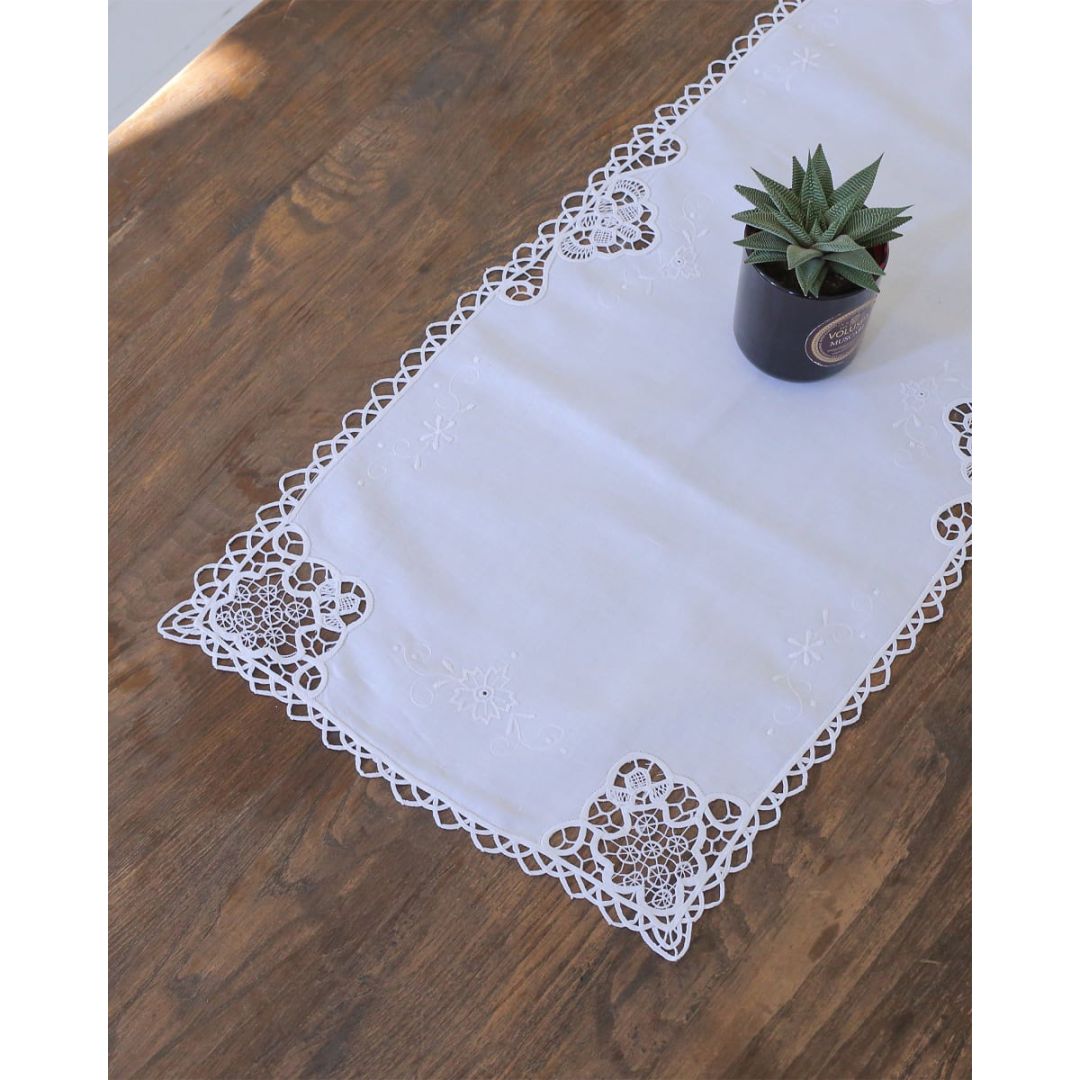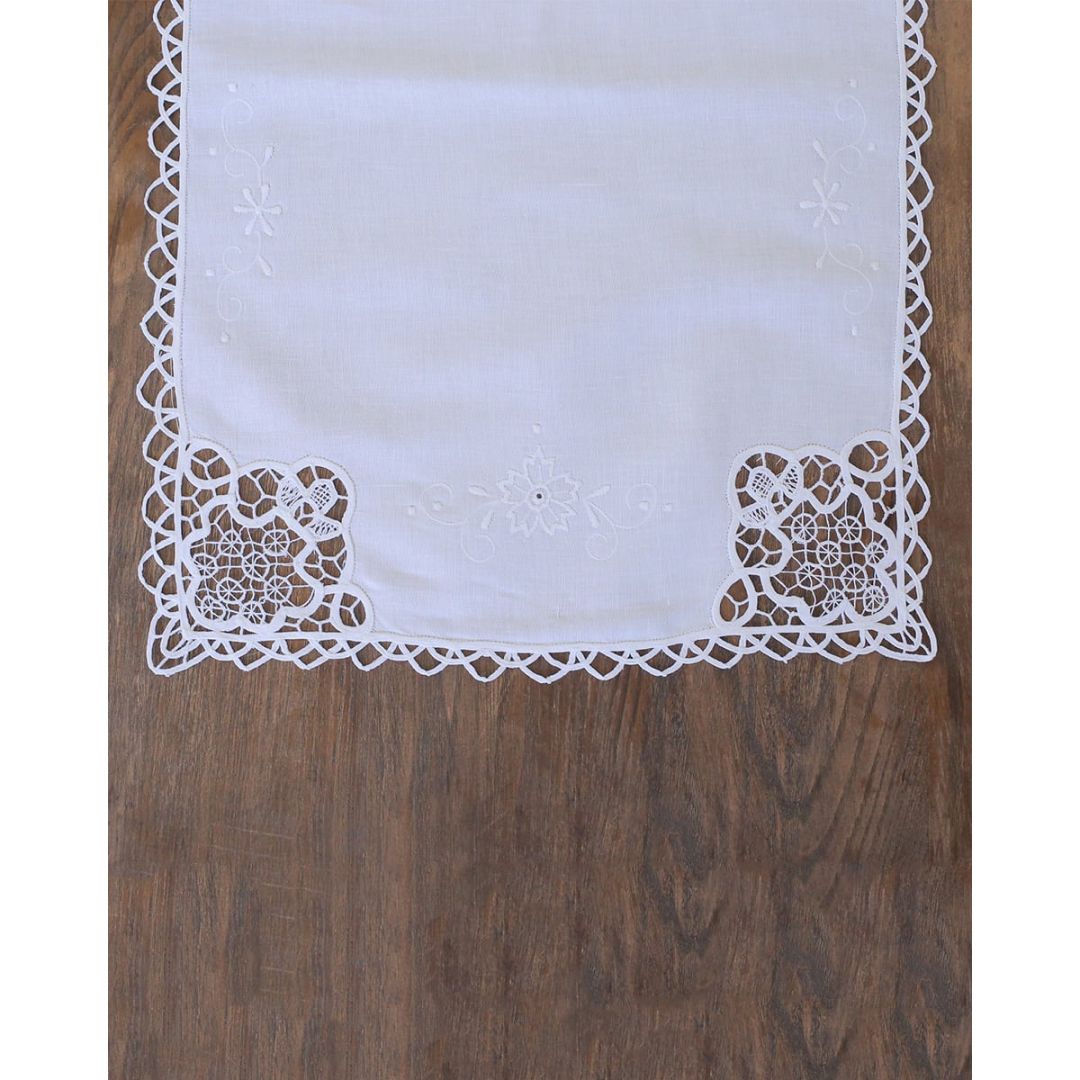 Σετ τραβέρσα και 2 καρέ από 100% βαμβάκι, κεντημένα με δαντέλα κηπούρ.