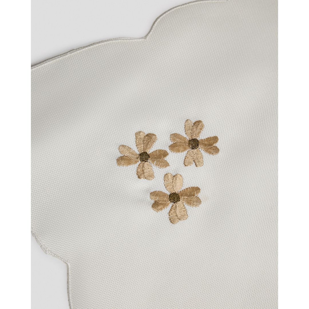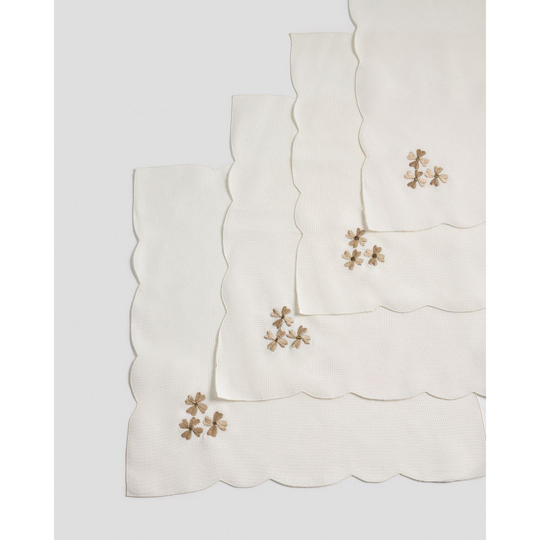 Σετ πετσέτες φαγητού (Διαστάσεις: Δείτε τις εδώ) με κέντημα τρεις μπεζ μαργαρίτες και γλώσσα στο τελείωμα, από λινό ύφασμα.