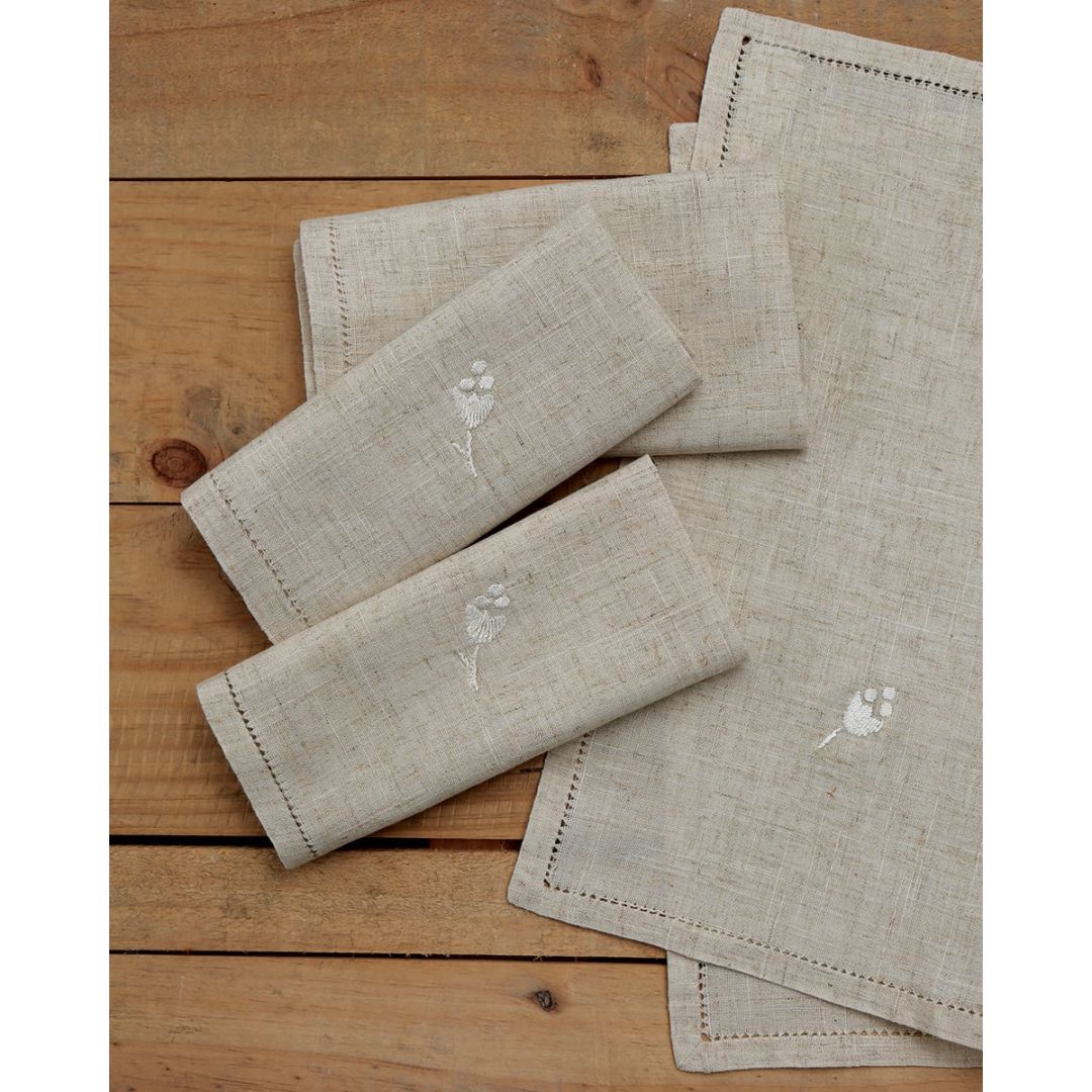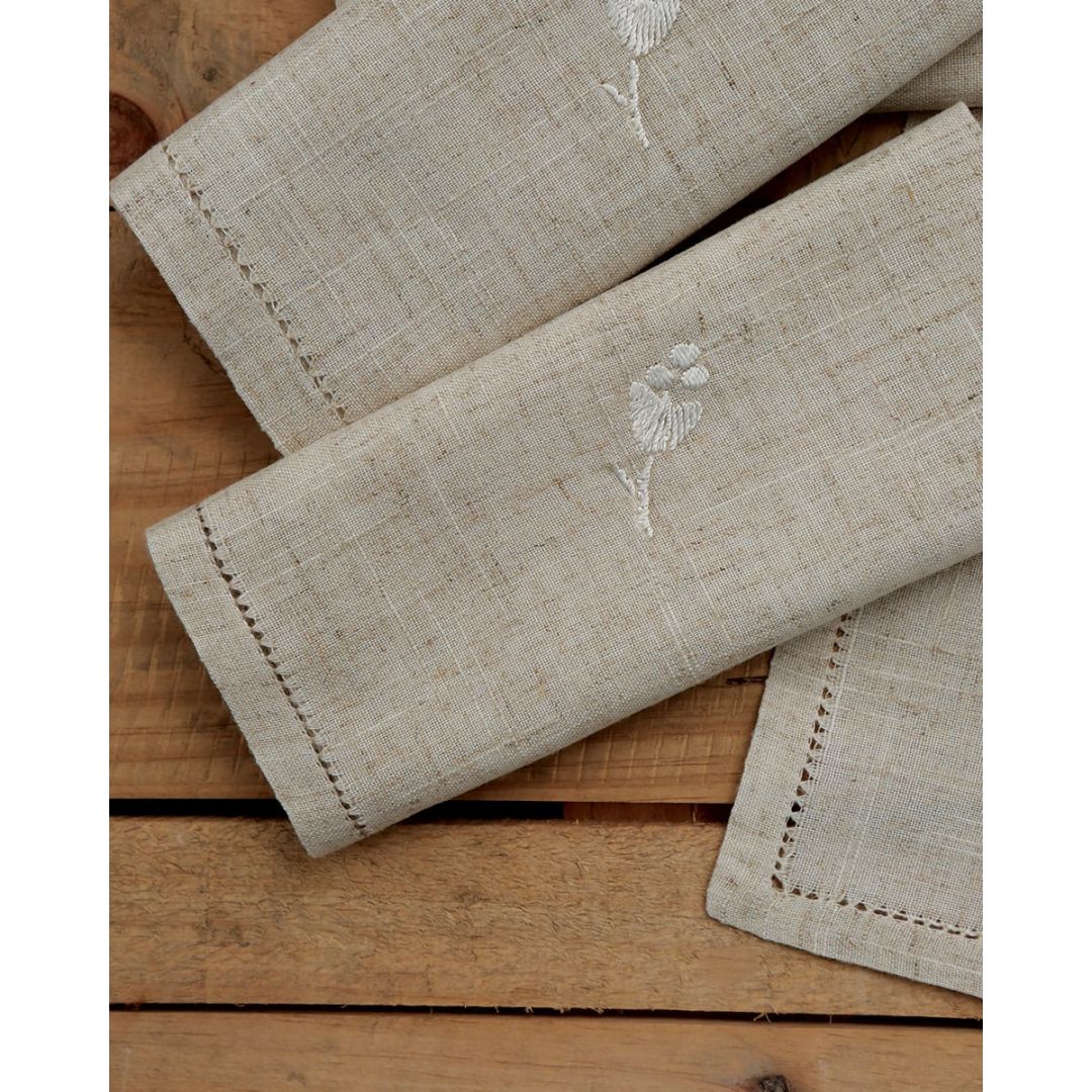 Σετ πετσέτες φαγητού (Διαστάσεις: Δείτε τις εδώ) με κέντημα φύλλο και αζούρ στο τελείωμα, από λινό ύφασμα.