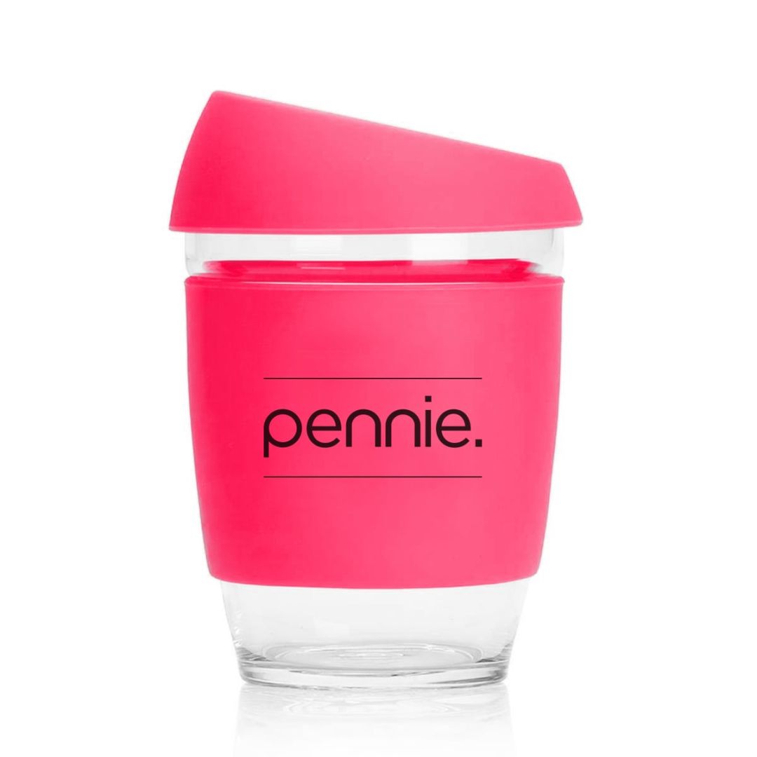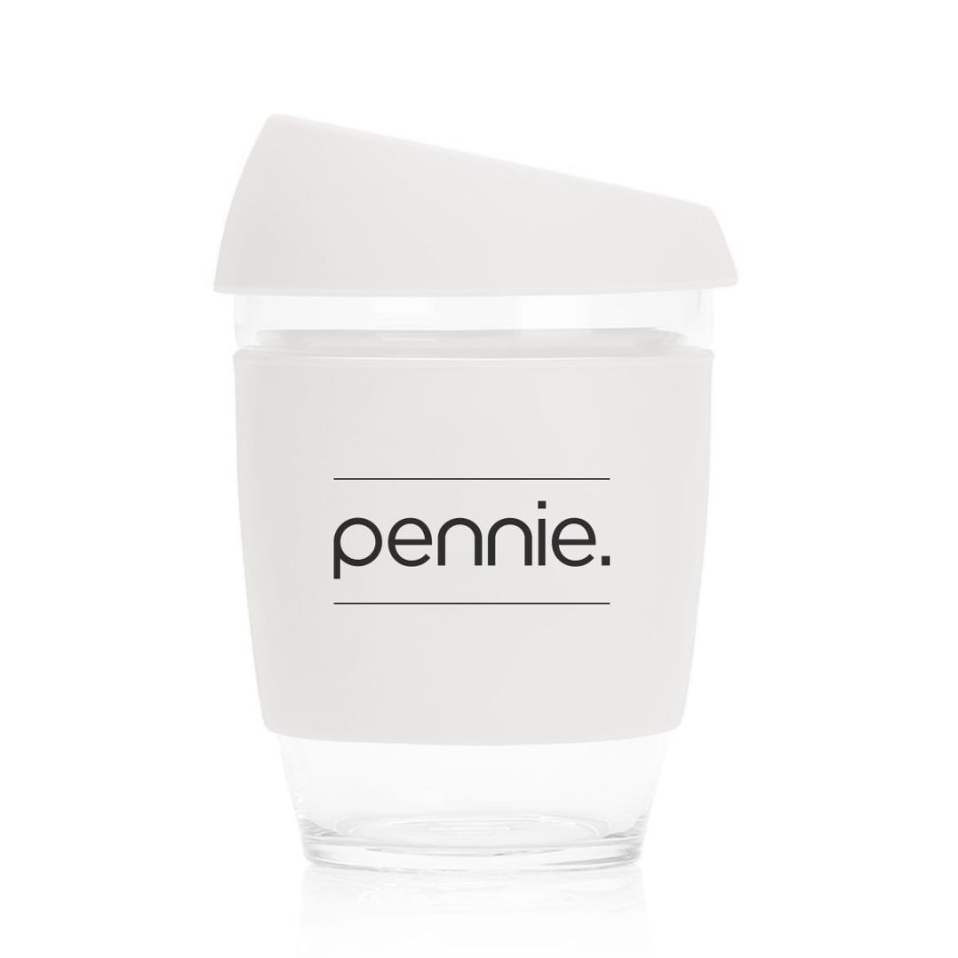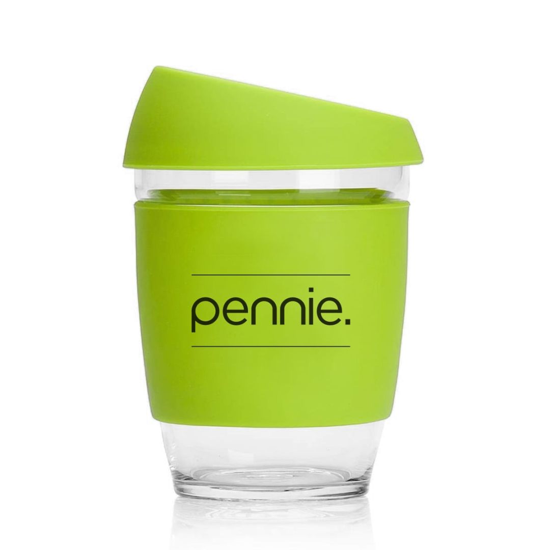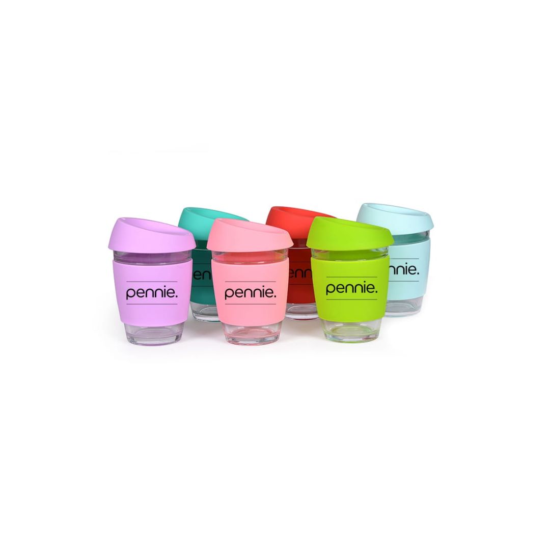 Γυάλινη οικολογική κούπα με καπάκι σιλικόνης και προσταυτευτικό κάλυμμα στο ίδιο χρώμα με το logo pennie. Η σειρά Cups ειναι κατασκευασμένη απο μη πορώδες βοριοπυριτικό γυαλί (pyrex) που το χαρακτηρίζει η υψηλή αντοχή στη θερμότητα και η εξαιρετική αντίστ