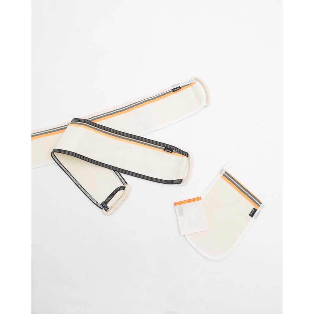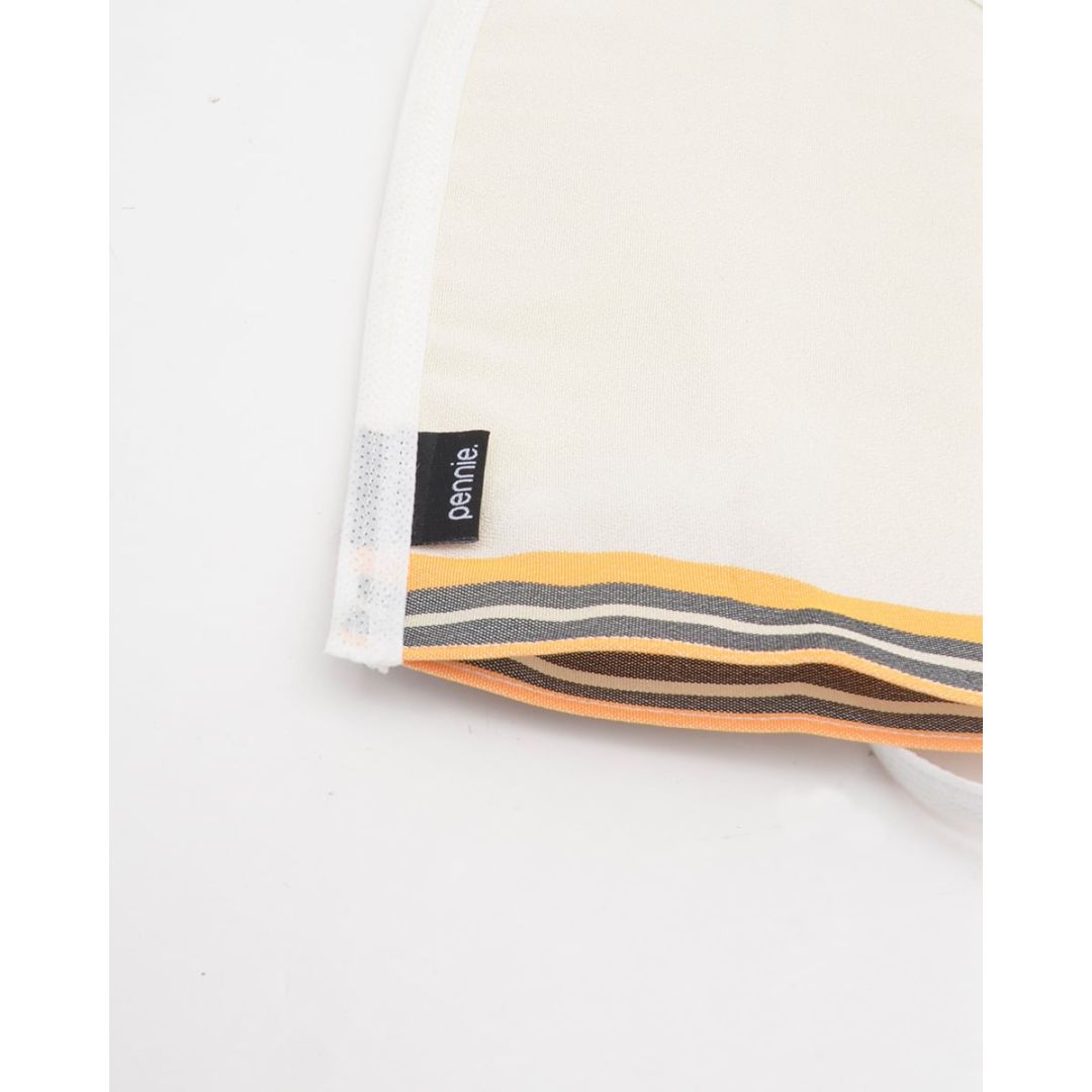 Εκρού υφαντό γάντι μπάνιου με κίτρινη και γκρι ρίγα.