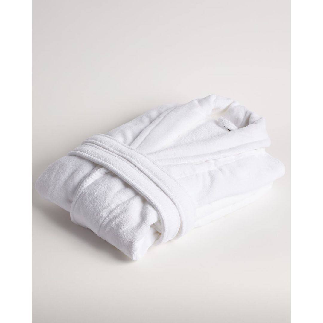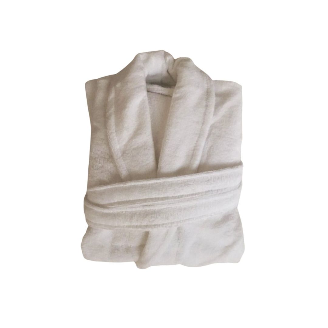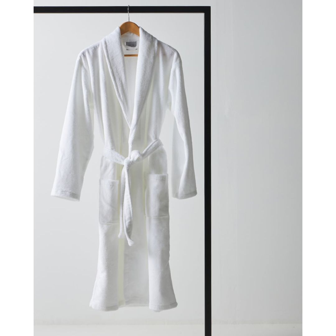 Απορροφητικό άσπρο βελουτέ μπουρνούζι πετσετέ εσωτερικά, με γιακά, τσέπες και ζώνη, από 100% βαμβάκι.