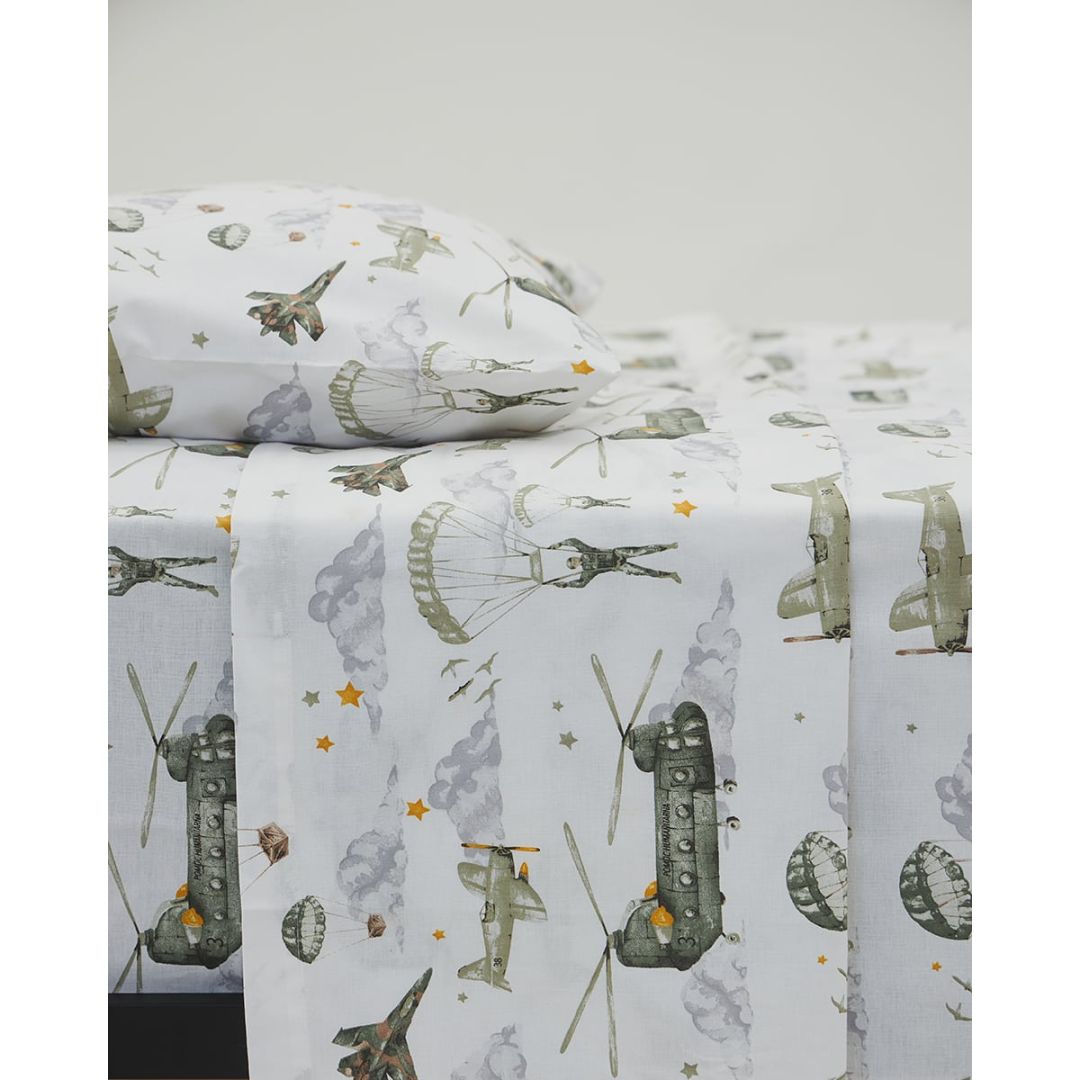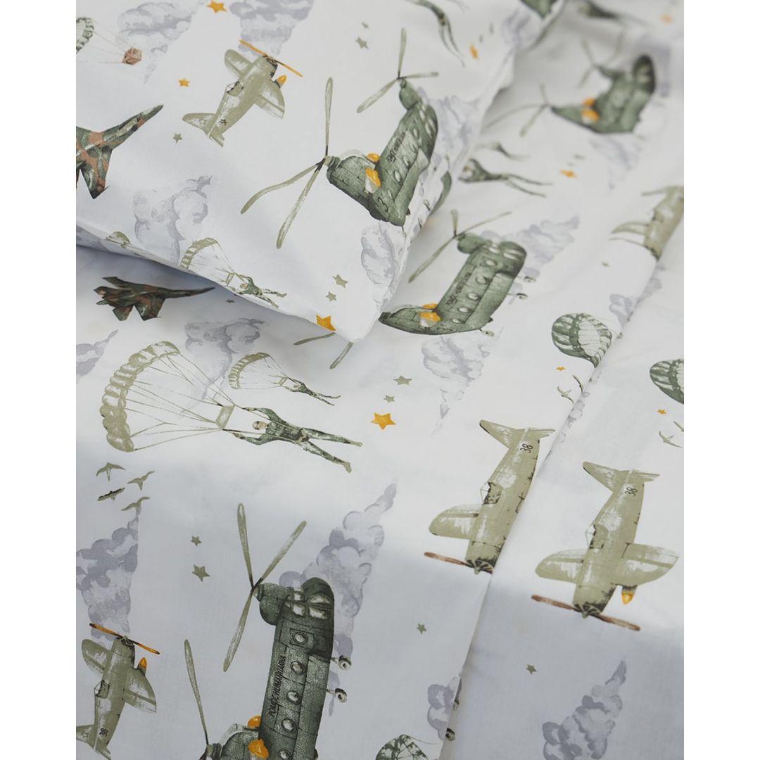 Σετ τριών τεμαχίων παιδικά εμπριμέ σεντόνια με σχέδιο αεροπλάνα, από 100% οργανικό βαμβάκι. Διατίθεται σε σετ μονά: 2 flat 160x240cm & 1 μαξιλαροθήκη 50x70cm.