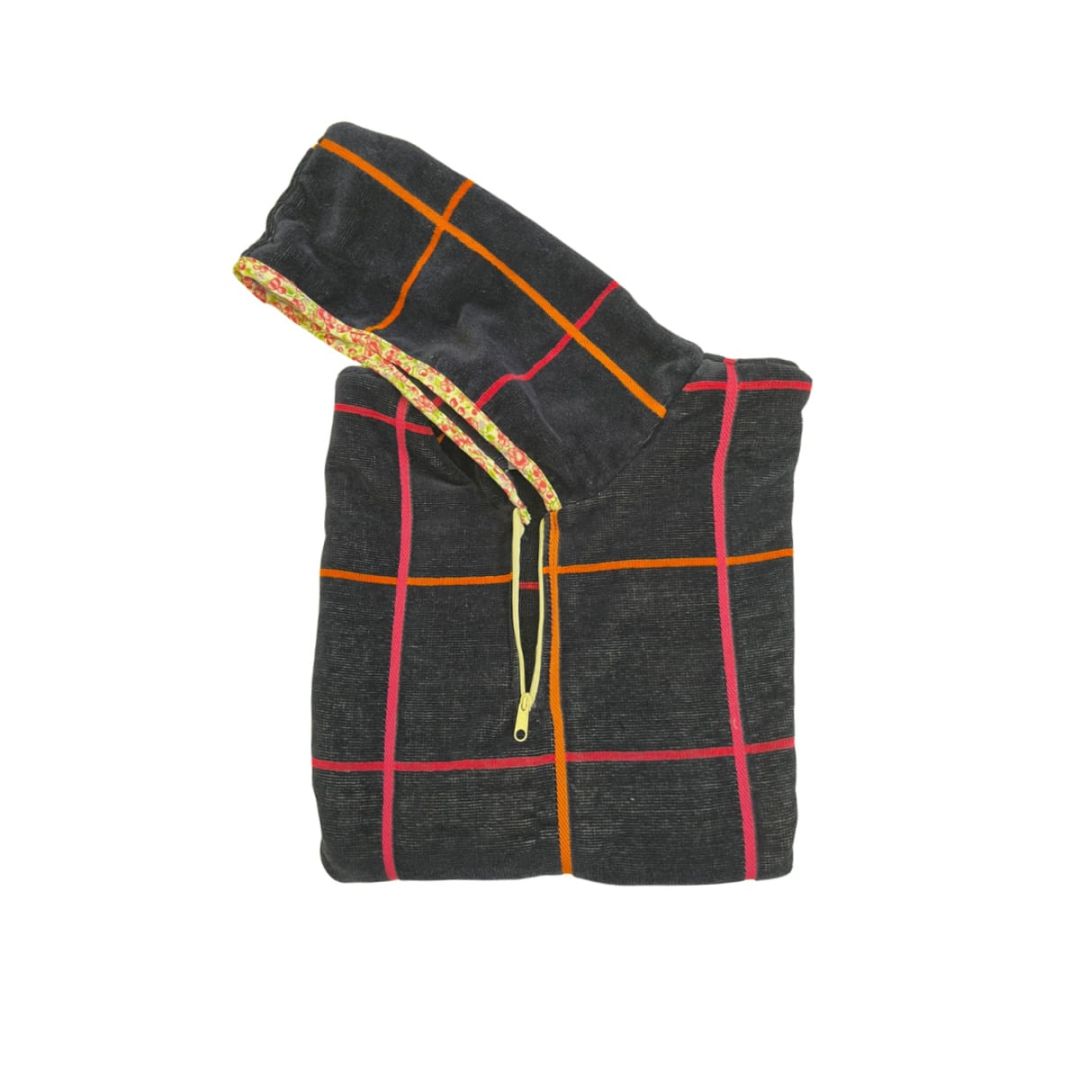 Παιδικό πόντσο με κουκούλα, καρώ σχέδιο & φερμουάρ στο λαιμό, από 100% βαμβάκι.
