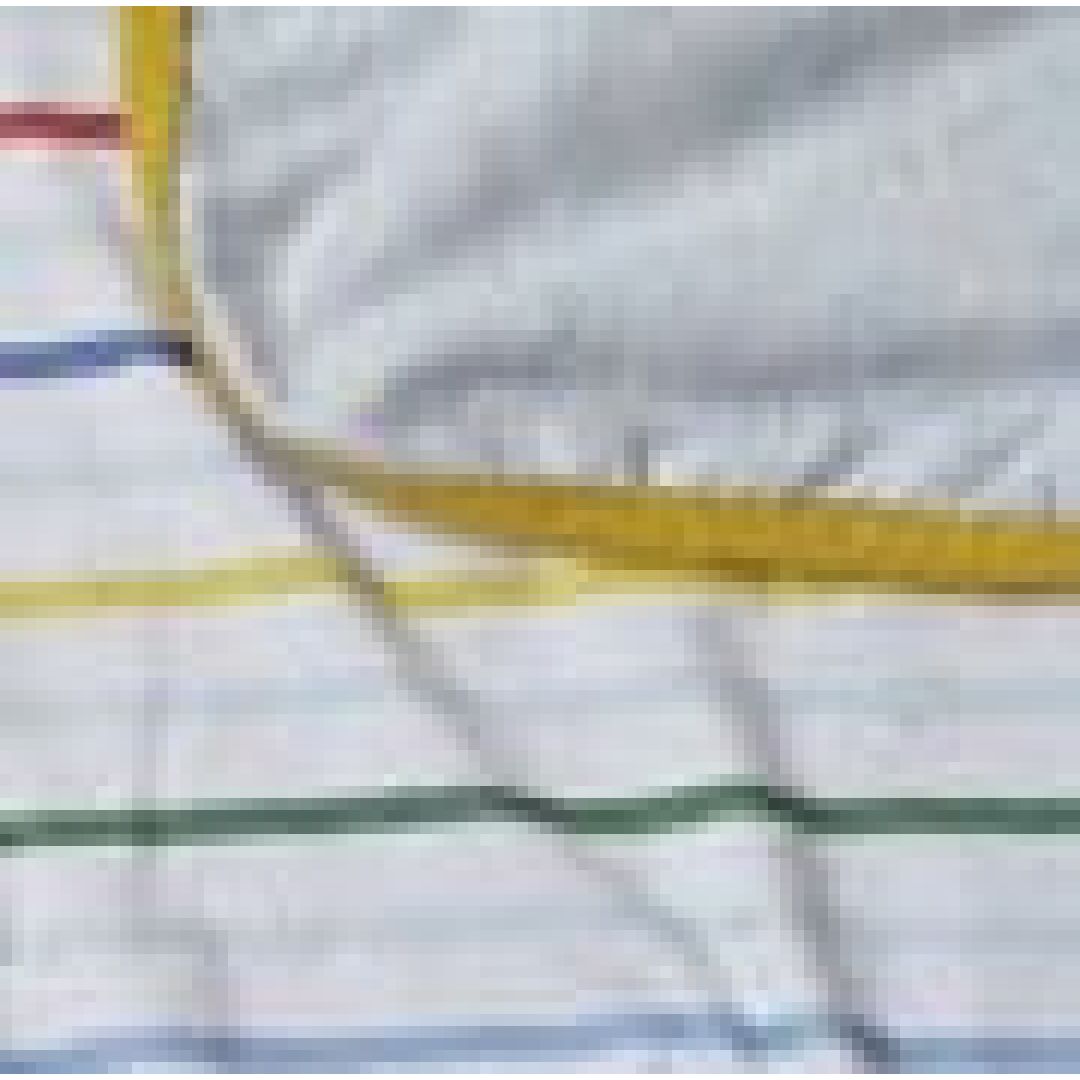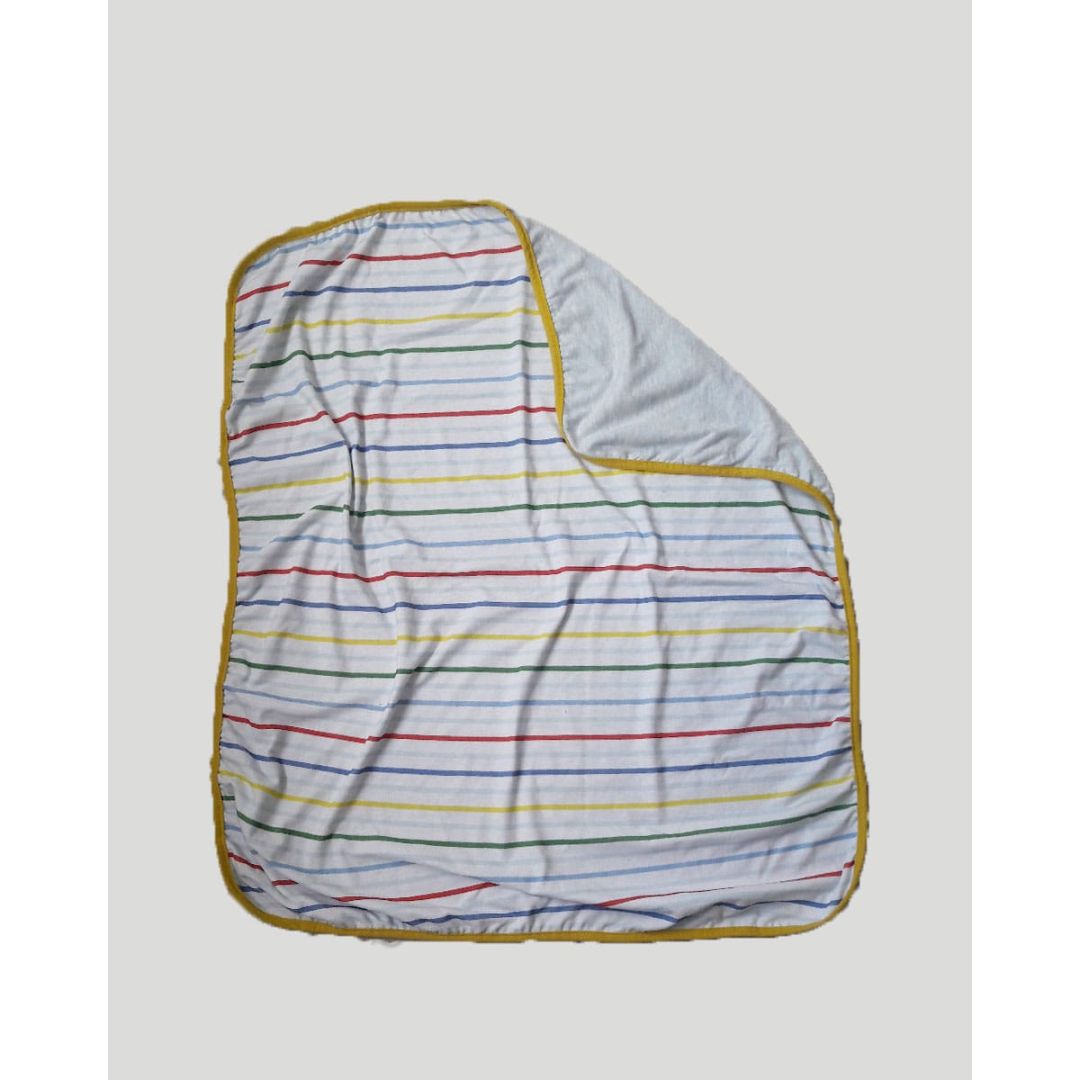Βρεφική σιέλ μακό κουβέρτα λίκνου με διπλό ύφασμα, πολύχρωμο ριγέ και περιμετρικό κίτρινο ρέλι, από 100% βαμβάκι.