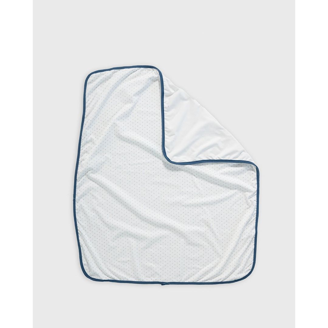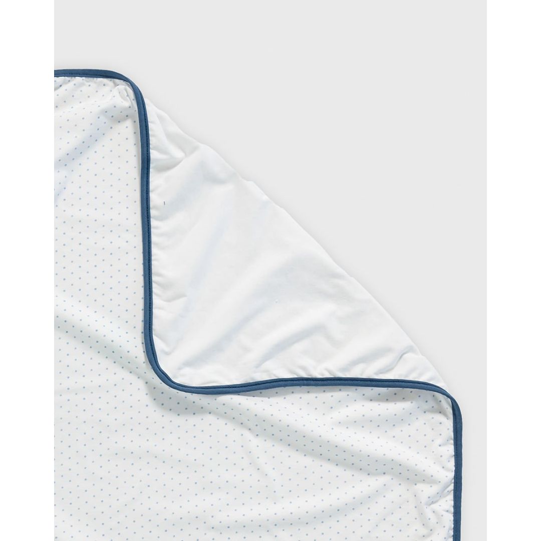 Βρεφική άσπρο μακό κουβέρτα λίκνου με διπλό ύφασμα, σιέλ πουά και περιμετρικό μπλε ρέλι, από 100% βαμβάκι.