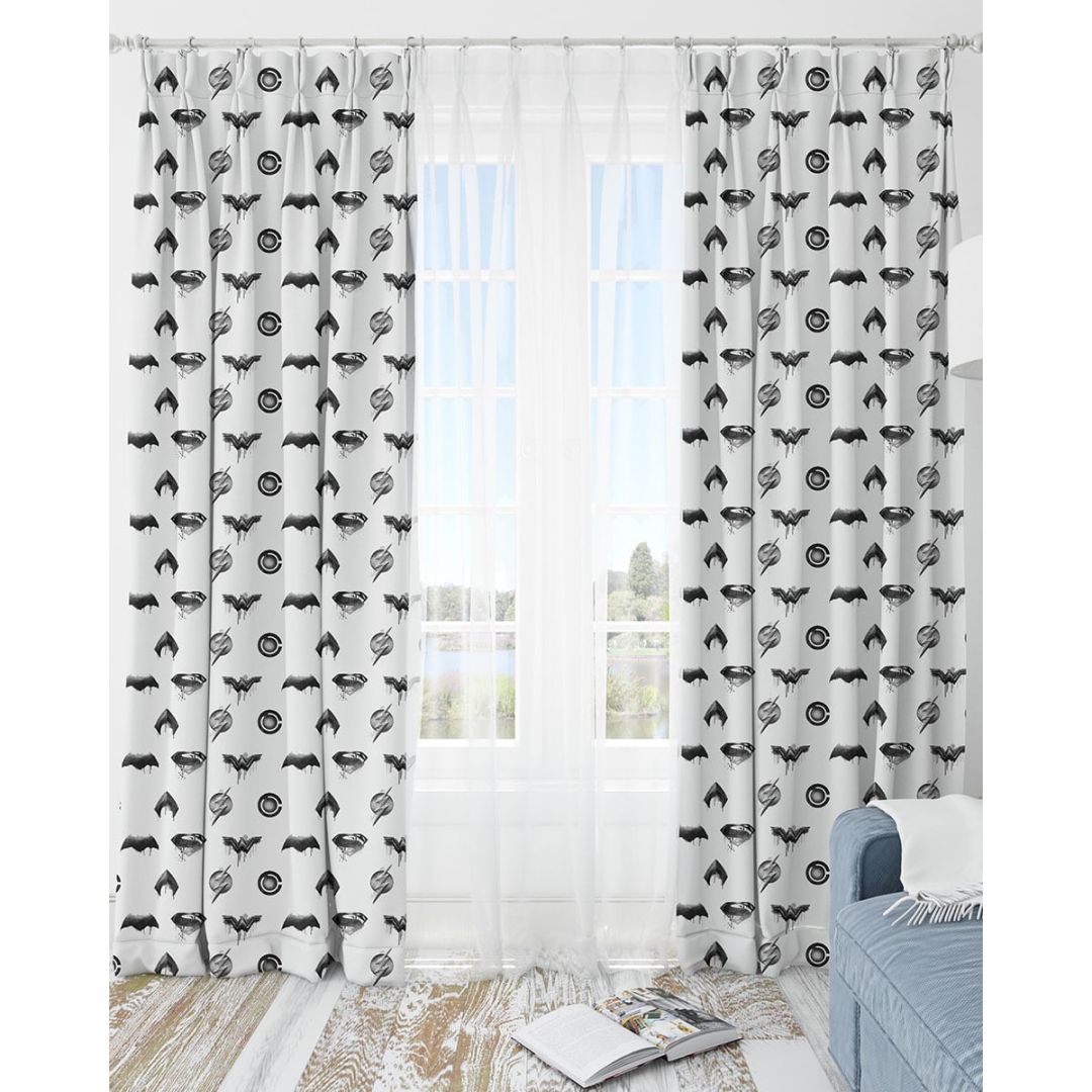 Έτοιμη ραμμένη κουρτίνα με κρίκους Warner Bros, σε στενό φύλλο 170x235cm, με παράσταση Justice League, από σύμμεικτο βαμβάκι.