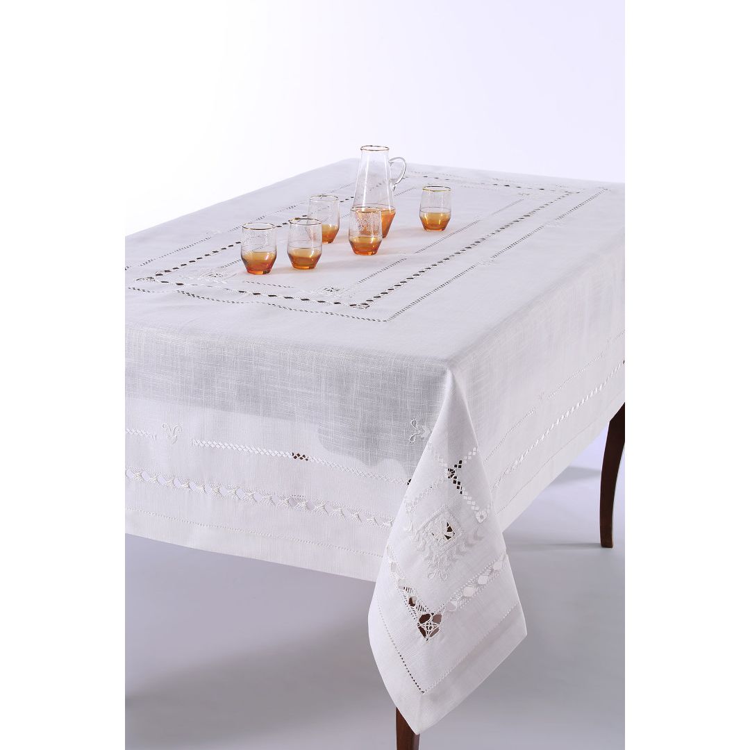 Χειροποίητο τραπεζομάντηλο με ανεβατή δουλειά και χειροποίητο αζούρ σε λινό πανί. Το τραπεζομάντηλο συνοδεύεται από 8 πετσέτες φαγητού με κέντημα.